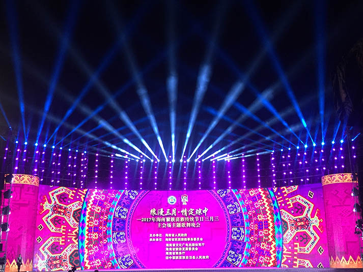 今晚(農(nóng)歷三月初三),由海南省人民政府主辦,海南省民族宗教事務(wù)委員會、海南省文化廣電出版體育廳、海南省旅游發(fā)展委員會、海南省商務(wù)廳、瓊中黎族苗族自治縣人民政府承辦,以“浪漫三月·情定瓊中”為主題的2017年海南黎族苗族傳統(tǒng)節(jié)日三月三主會場活動(dòng)在瓊中三月三廣場隆重開幕。浩洋電子自主研發(fā)特寶麗品牌近500臺高品質(zhì)專業(yè)舞臺燈光產(chǎn)品:全能王三合一G9 HYBRID、切割燈V3000P、光束燈G9B、染色燈V1500TW、大光束燈V1500TB、防水固定染色燈OVAL 60D等炫耀擔(dān)任瓊中主會場舞臺燈光主力,為今年海南“三月三”民俗節(jié)慶晚會傾力獻(xiàn)力。
