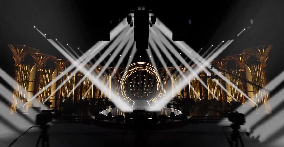 作為本季舞美的情懷加分項,極具節(jié)目標識性的圓環(huán)赫然矗立中央,在全新加入的流線燈光的營造下,更具超現(xiàn)代科技氛圍。而圓環(huán)兩邊,順次排開十二根金色珠光圓柱,柱體之間陳列的旋轉(zhuǎn)體則是本季創(chuàng)新的重點。該旋轉(zhuǎn)體分為三面,其中兩面為亞克力三角細柱,柱上貼有LED數(shù)碼條,當歌手演唱時,旋轉(zhuǎn)體可作為渲染燈光的介質(zhì),承接多種曲風(fēng)的氛圍效果;另外一面則為矩形燈陣。當浩洋燈光亮起時,貫徹了一如既往的高端視感,打造了新一輪的視覺盛宴,為觀眾帶來璀璨奪目的視覺享受。