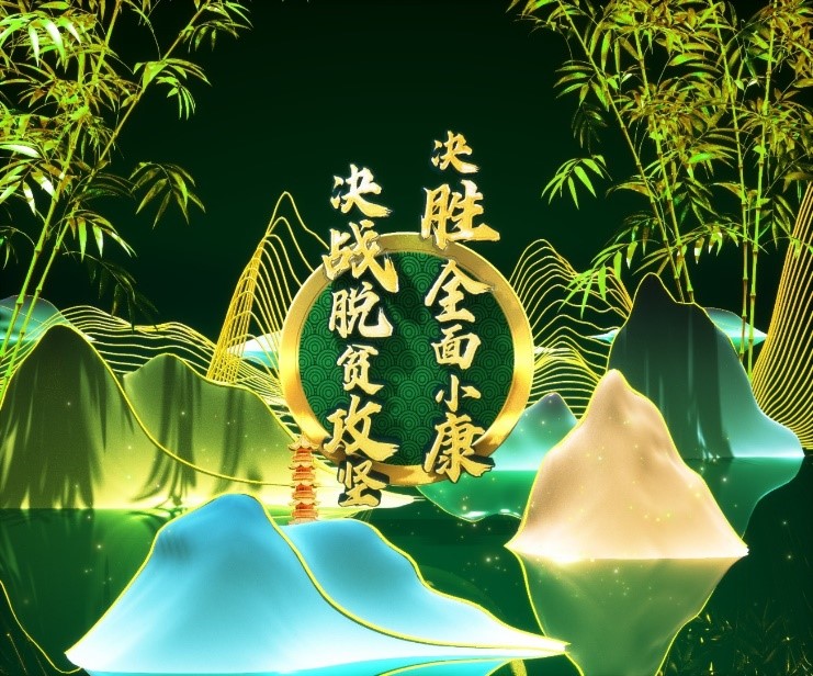 該篇章以綠色為主色調(diào),青山流水為景,畫面由畫筆描繪錦鯉,翠竹傍山,盡顯中國一片綠水青山的大好景致。以此畫面帶出2020年我國將全面建成小康社會,實(shí)現(xiàn)第一個(gè)百年奮斗目標(biāo)的堅(jiān)定決心。