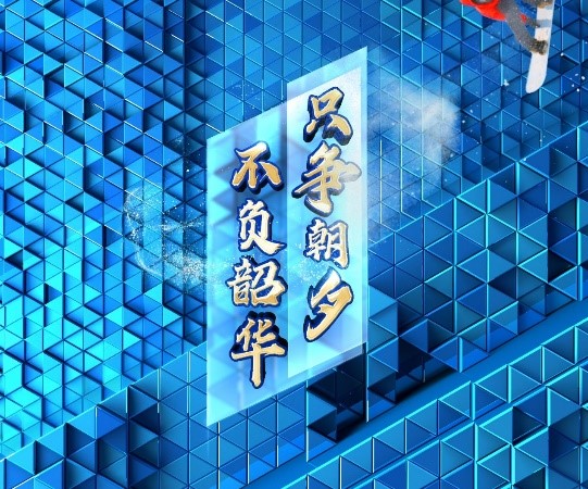 該篇章以藍(lán)色為主背景色,主要展示中國的科技發(fā)展成果,包含航天器,太空站等科技元素,配以奧運(yùn)冰雪元素帶出本篇章的主題“不負(fù)韶華 只爭朝夕”。