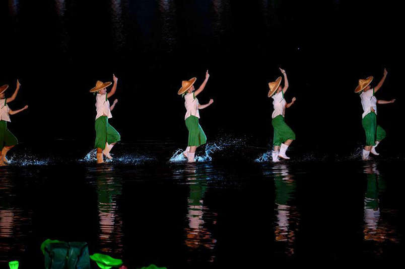 由于實(shí)景演出的舞美要求不能破壞大自然的原始形態(tài),因此現(xiàn)場(chǎng)對(duì)視覺(jué)效果的塑造都押在了燈光創(chuàng)作上,由于現(xiàn)場(chǎng)表演規(guī)模宏大,尤其是在水面上染色,要做到色彩單純,光線分布均勻且具備足夠的亮度,同時(shí)保證遠(yuǎn)景、近景的清晰可見(jiàn),給觀眾帶去強(qiáng)烈的視覺(jué)感受。