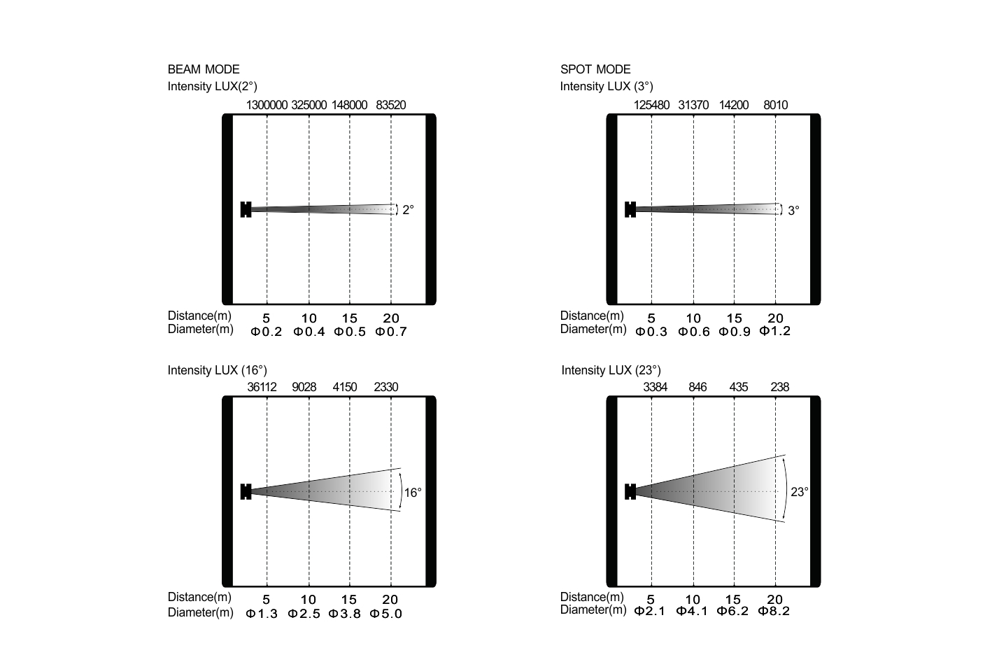 變焦范圍:光束模式:2°-16°,圖案模式:3°-23°