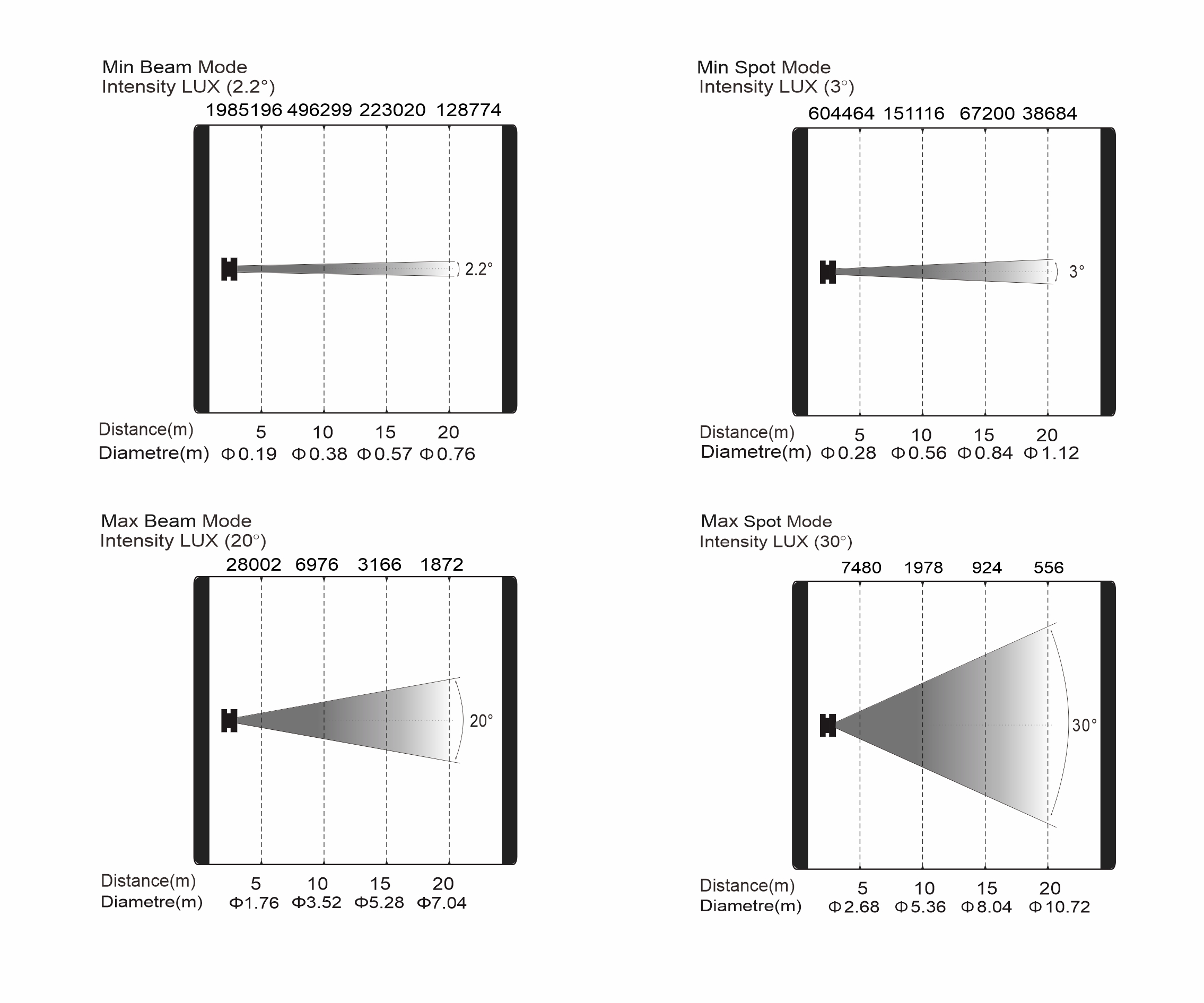 變焦范圍:光束模式:2.2°-20°,圖案模式:3°-30°