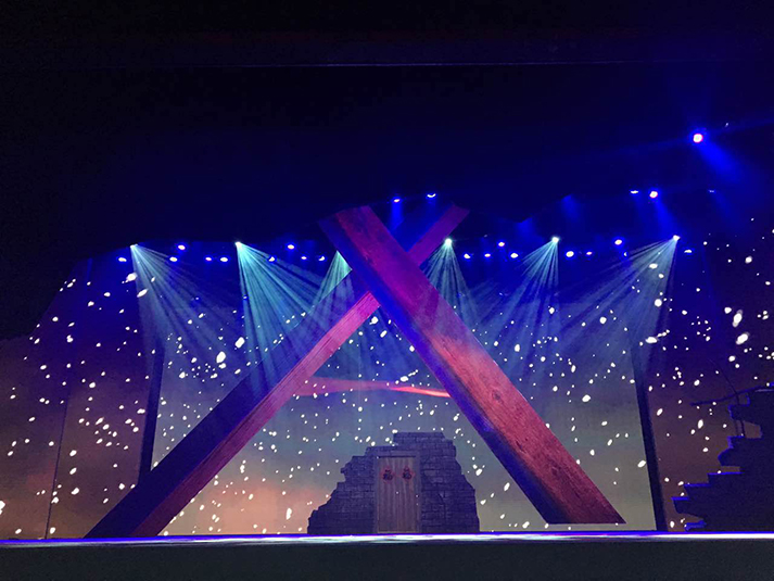 "我從舞臺劇的燈光設(shè)計思路出發(fā),用沿幕把所有燈具在舞臺上隱藏起來,使觀眾看不見燈具只看見色彩和光線。這次晚會共采用了80臺1500w圖案燈(特寶麗V2500S)、60臺1500w染色燈、120臺光束燈(特寶麗PT320B)、160臺LED燈、40臺切割燈(特寶麗V3000P)以及4臺追光燈(特寶麗FS300M)。切割燈特寶麗V3000P主要做面光使用,用于把舞臺多余的光切掉,使舞臺更干凈更透亮,同時也讓演員和舞美道具等清晰可見?!靶′撆凇焙蒲蠊馐鵁鬚T320B主要用于打造炫目的舞臺效果;我在設(shè)計中將圖案燈里面的圖案與染色燈的色彩功能充分疊加之后鋪照在舞臺上,這種方式能夠呈現(xiàn)出更加繽紛和絢麗的圖案效果;地流燈和側(cè)光的運用則讓每一位演員都在舞臺上呈現(xiàn)更加立體。