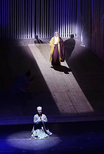 《鑒真東渡》講述了公元742年鑒真因日本國(guó)僧人邀請(qǐng)先后6次東渡,歷經(jīng)千辛萬(wàn)苦終于在754年到達(dá)日本國(guó),傳播中華文化這一史實(shí),藝術(shù)再現(xiàn)了這段中日文化交流的千古佳話。此次彩排中,全劇通過一渡幻海、二渡愿海、三渡迷海、四渡覺海、五渡心海、六渡慧海六個(gè)部分,以真實(shí)的人物和虛幻的場(chǎng)景,藝術(shù)展現(xiàn)了鑒真東渡的艱辛歷程。在正式演出之時(shí),揚(yáng)州大明寺的仁如法師,也將會(huì)在舞臺(tái)邊上的蓮花座上吟誦佛法經(jīng)典,伴隨著劇情的發(fā)展,他將吟誦《大悲咒》、《心經(jīng)》等,為劇情推波助瀾。
