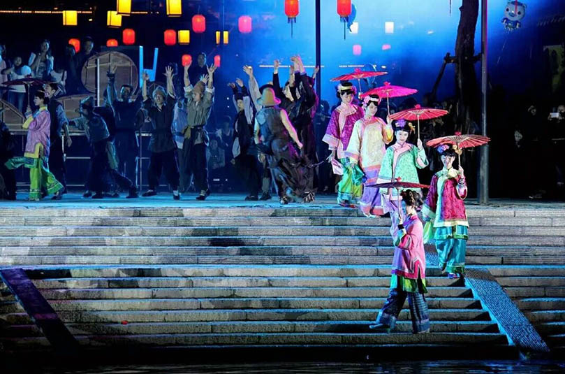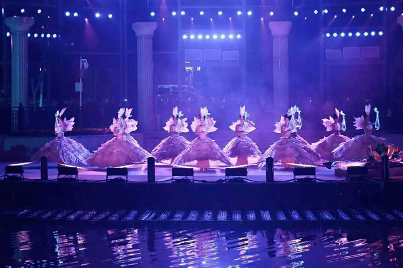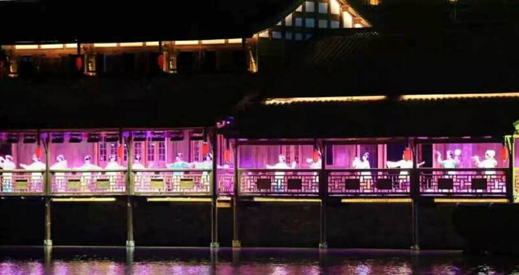 《夢回穿紫河》圍繞“河”“船”“人”三個關(guān)鍵詞,分“紫漁歌”、“依水筑城”、“河街舊事“、“浪漫之旅”四個篇章,利用大船、燈光、煙花等元素,將常德文化與現(xiàn)代機(jī)械光電技術(shù)結(jié)合,還原包括“古河”、“桃花源”、“沅水號子”等文化藝術(shù)印象,將觀眾帶入一個光與影交相輝映、水與人和諧共存的美好境界。乘坐“水上巴士”沿著11公里長的穿紫河河道游覽,享受常德老河街原景、折子戲、常德絲弦、劉??抽砸魳穭〉葘?shí)景演出,再配合燈光特效等高科技手法,常德本地民俗文化與現(xiàn)代科技的完美結(jié)合,打造出一場古典與現(xiàn)代結(jié)合的唯美大賞。
