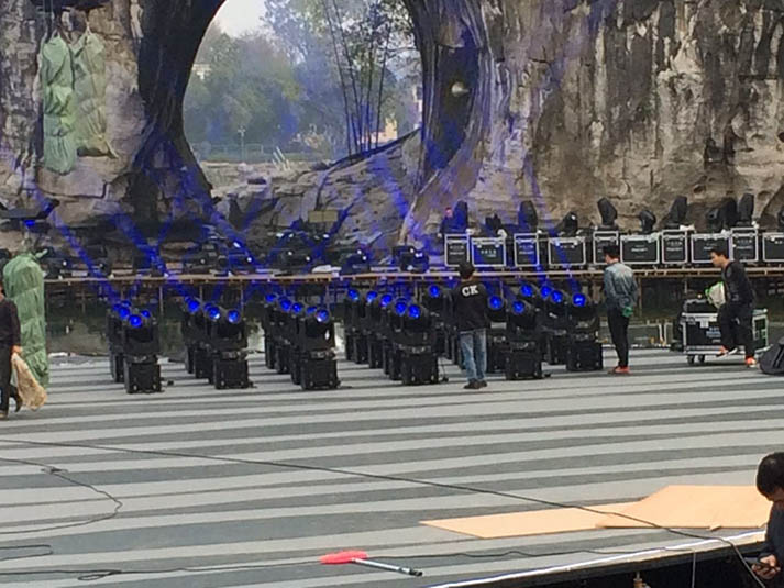 此次春晚桂林分會(huì)場(chǎng)的最大亮點(diǎn)是在舞臺(tái)燈光設(shè)計(jì)中使用威亞遙控?zé)艟咄瓿蓱敉鈱?shí)景演出,這是在國(guó)際國(guó)內(nèi)首次在半空使用威亞遙控?zé)艟?。作為一套最先進(jìn)的燈光設(shè)備,它的難度在于燈光運(yùn)動(dòng)要與威亞運(yùn)動(dòng)同步。燈具需要從功能上首要實(shí)現(xiàn)燈光照明,但更重要的是結(jié)合桂林山水,在空中制造形式多樣的藝術(shù)圖案、在水面形成精美絕倫的倒影,呈現(xiàn)出水天相連、相互映襯的藝術(shù)效果。