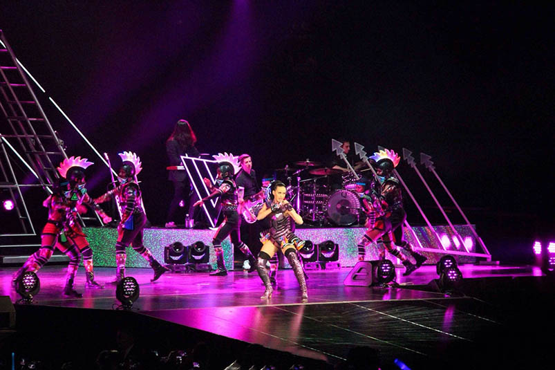 Katy Perry以開場曲《Roar》拉開序幕,之后《E.T》、《California Gurls》(加州女孩)、《TeenageDream》(花漾年華)、《Wide Awake》(如夢初醒)等金曲一首不落,引發(fā)粉絲的尖叫聲和喝彩此起彼伏。配合演唱會主題,水果姐造型百變服飾斑斕,她時而變身俏麗貓女在《Hot N Cold》(忽冷忽熱)的音樂中與舞伴嬉戲,時而以埃及艷后的高貴之姿騎優(yōu)雅坐上《DarkHourse》(黑馬),一轉(zhuǎn)眼又身穿向日葵長裙化身女神抱著吉他動情演繹《The One That Got Away》(離開的人是你),讓人看得眼花繚亂。