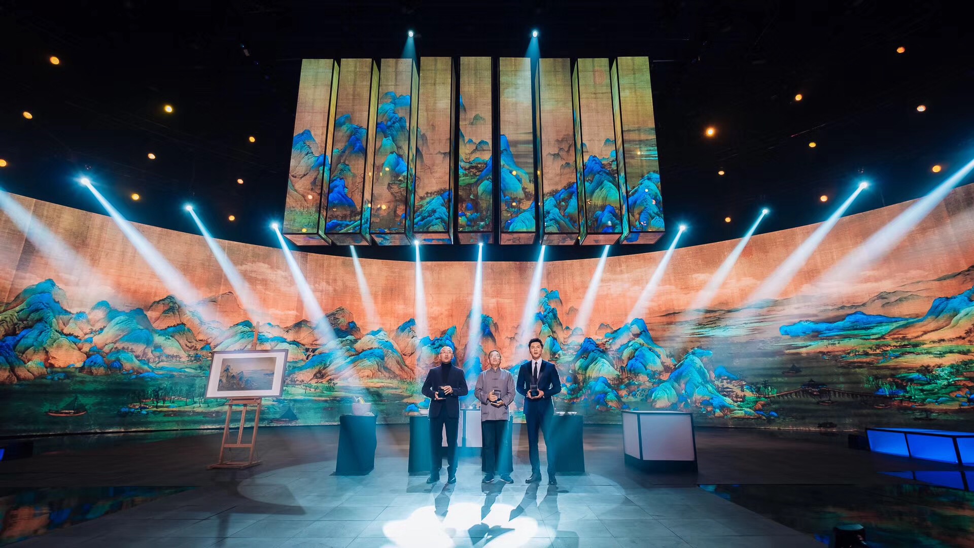 在舞美方面,《國家寶藏》節(jié)目組特別將所有舞臺(tái)主視覺都設(shè)置在一塊長43米、高7米的巨型LED環(huán)幕上,讓觀眾在見不到國寶實(shí)物的情況下也能以直觀的感受體驗(yàn)到國寶的震撼美。在整個(gè)舞臺(tái)的設(shè)計(jì)上,節(jié)目組將中國古典韻味和現(xiàn)代舞臺(tái)科技相結(jié)合,融合紗盒投影視覺呈現(xiàn)、透視冰屏柱視覺呈現(xiàn)、透視冰屏柱臺(tái)型變幻、巨型環(huán)幕視覺呈現(xiàn)四大特點(diǎn)于一體。在場景環(huán)境的構(gòu)建與更替上都呈現(xiàn)出精致逼真的舞臺(tái)效果,這種舞臺(tái)視覺上的極致沖擊力也成為節(jié)目吸引眼球的一大亮點(diǎn)。