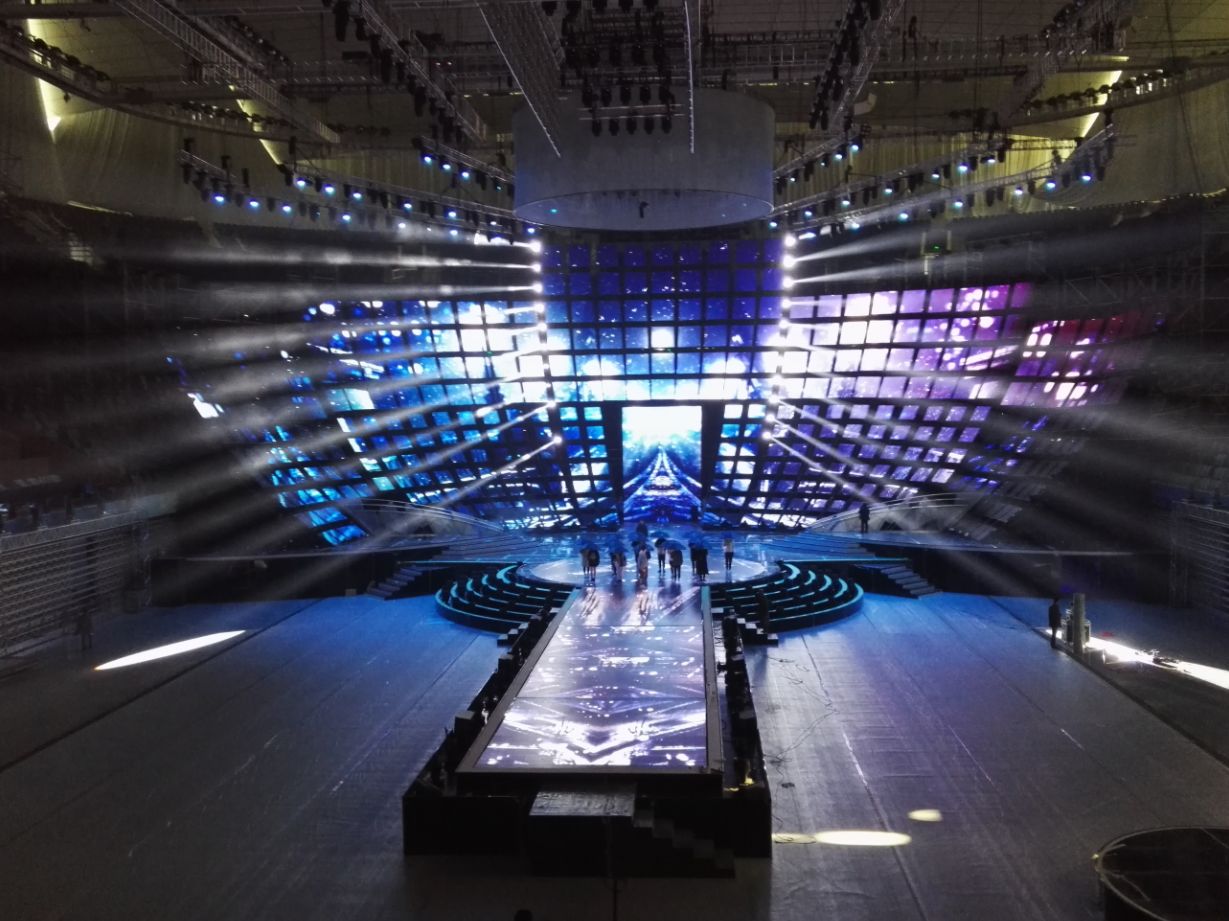 追求新亮點(diǎn)的江蘇衛(wèi)視今年刷新了演唱會(huì)舞臺(tái):四面臺(tái)升級(jí)為360度全景巨型圓舞臺(tái),給觀眾帶來(lái)前所未有的視覺(jué)沖擊;機(jī)械燈臂組成變形空間站,天幕地屏配合猶如浩瀚宇宙。根據(jù)比利時(shí)的燈光設(shè)計(jì)師Ignace介紹,去年所有構(gòu)造和場(chǎng)景都是為扁長(zhǎng)型舞臺(tái)而設(shè)計(jì),今年所有設(shè)計(jì)都是為了讓觀眾感受到前所未有的一種“沉浸感”,“(每一個(gè)區(qū)域)觀眾到舞臺(tái)距離一致,這和去年有很大的不同,觀眾的感受獨(dú)具一格,是宇宙的感覺(jué)?!?